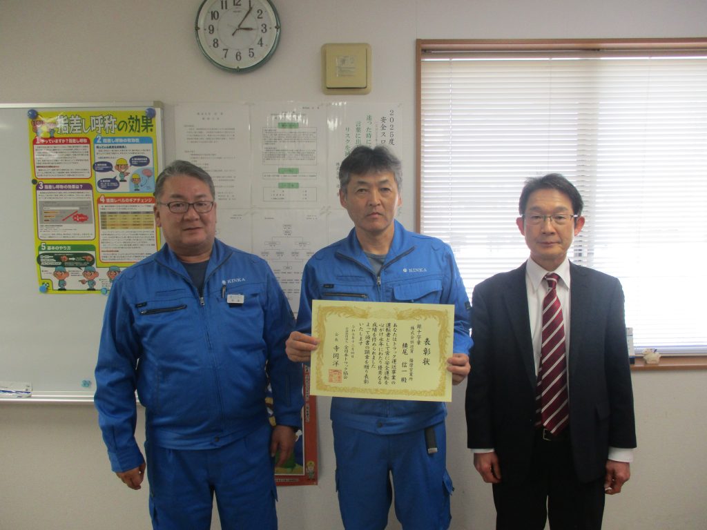優良ドライバー表彰について 2026年2月27日 最終更新日時 : 2026年2月27日 kinka 10年間無事故無違反につき、弊社、播磨営業所 横尾 信一さんが公益社団法人 全日本トラック協会様より銀十字表彰を賜りました。 播磨営業所・杉本所長 横尾ドライバー 重松取締役